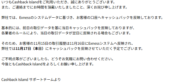 始めて使ってみてなかなかキャッシュバックがつかないな~って思ってチャットを試すついでに連絡してみました!ちなみにexnessです。